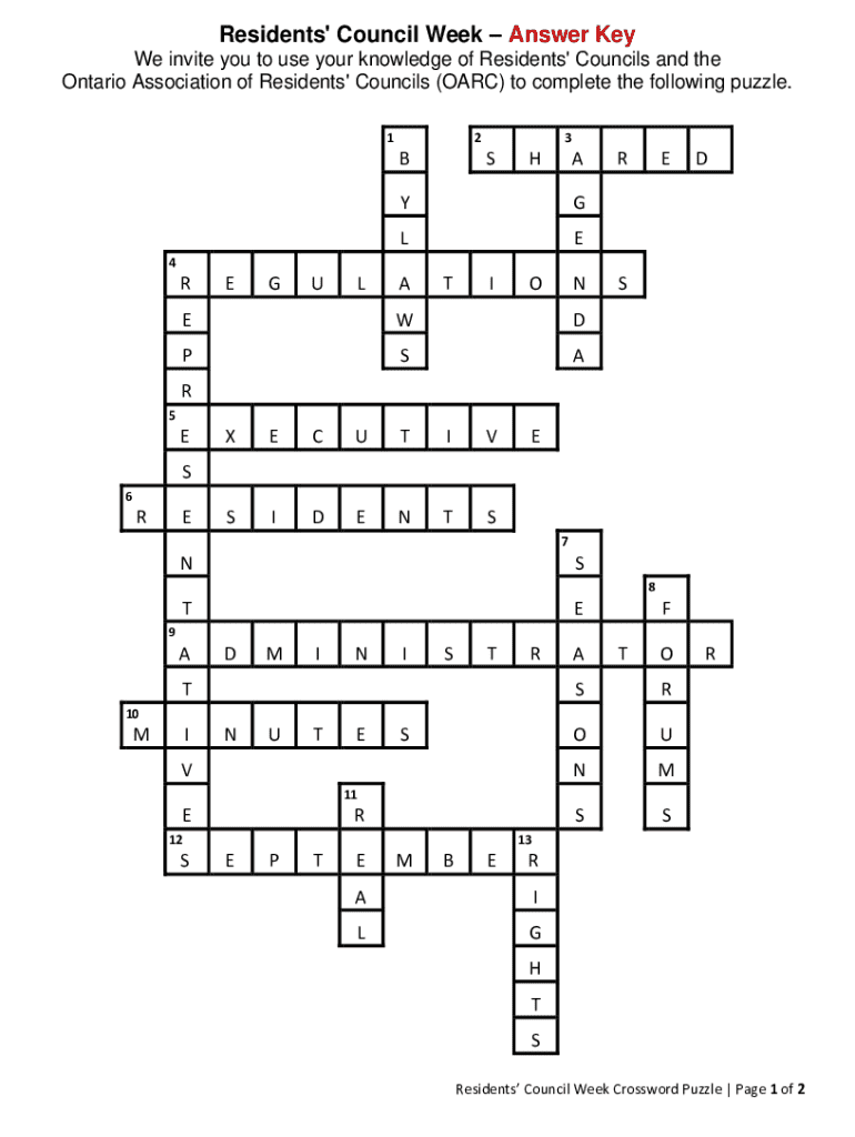 This document provides answers to the crossword puzzle related to Residents\' Councils and the Ontario Association of Residents\' Councils (OARC). It includes solutions to various clues regarding