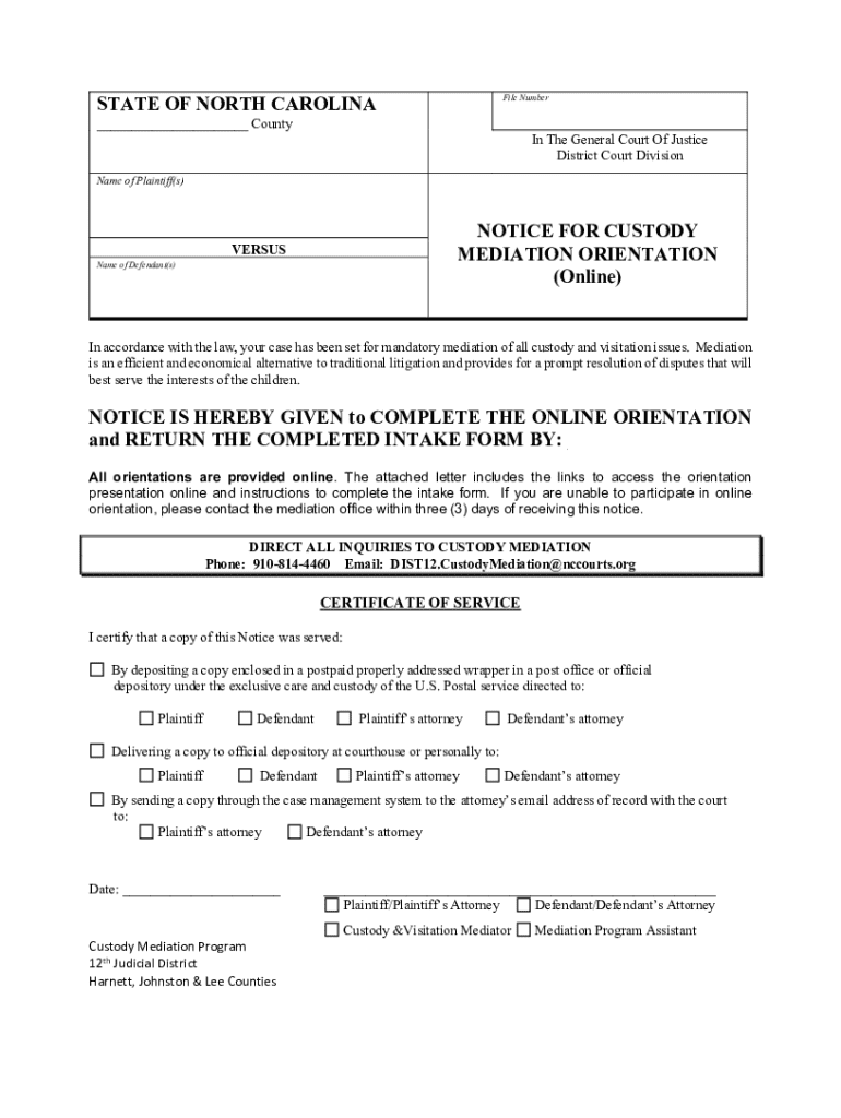Get the free Notice for Custody Mediation Orientation