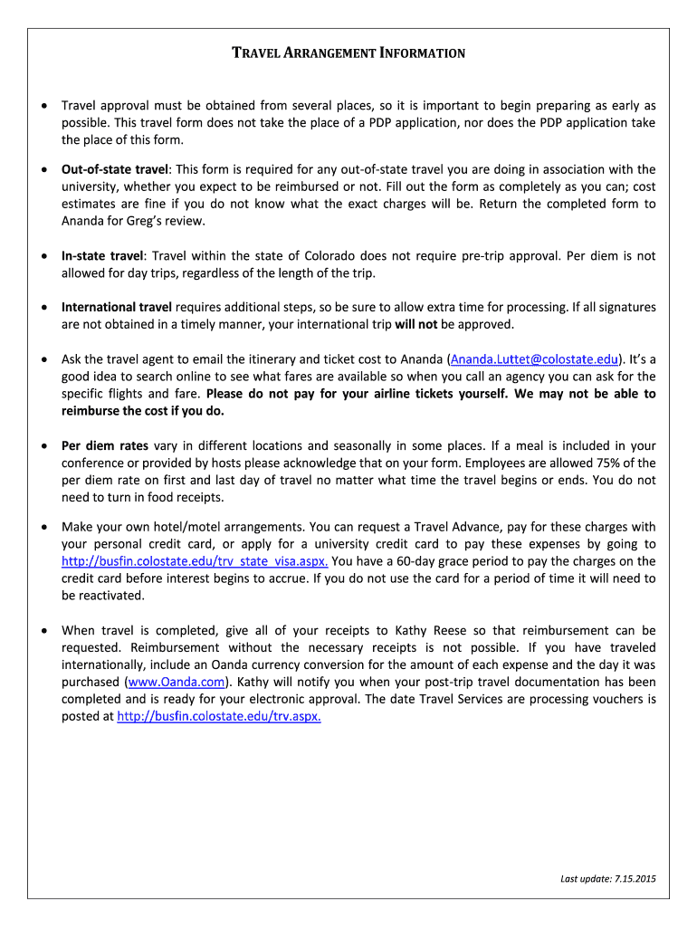 TRAVEL ARRANGEMENT INFORMATION ? Travel approval must be obtained from several places, so it is important to begin preparing as early as possible. This travel form does not take the place of a PDP