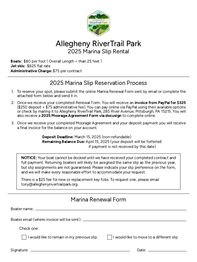 This document outlines the details for reserving a marina slip at Allegheny RiverTrail Park for the year 2025, including rental fees, payment process, deadlines, and necessary forms.