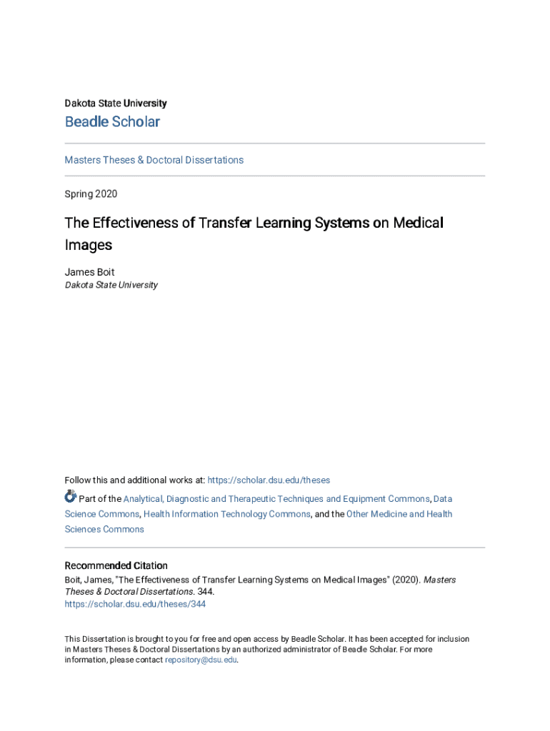 Dakota State UniversityBeadle Scholar Masters Theses & Doctoral Dissertations Spring 2020The Effectiveness of Transfer Learning Systems on Medical Images James Boit Dakota State UniversityFollow this