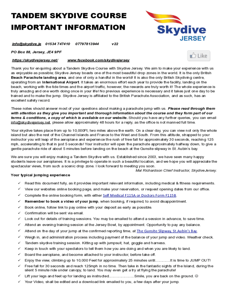 TANDEM SKYDIVE COURSE IMPORTANT INFORMATION info@skydive.je01534 74741007797813944v22PO Box 88, Jersey, JE4 9PF https://skydivejersey.net/www.facebook.com/skydivejerseyThank you for enquiring about