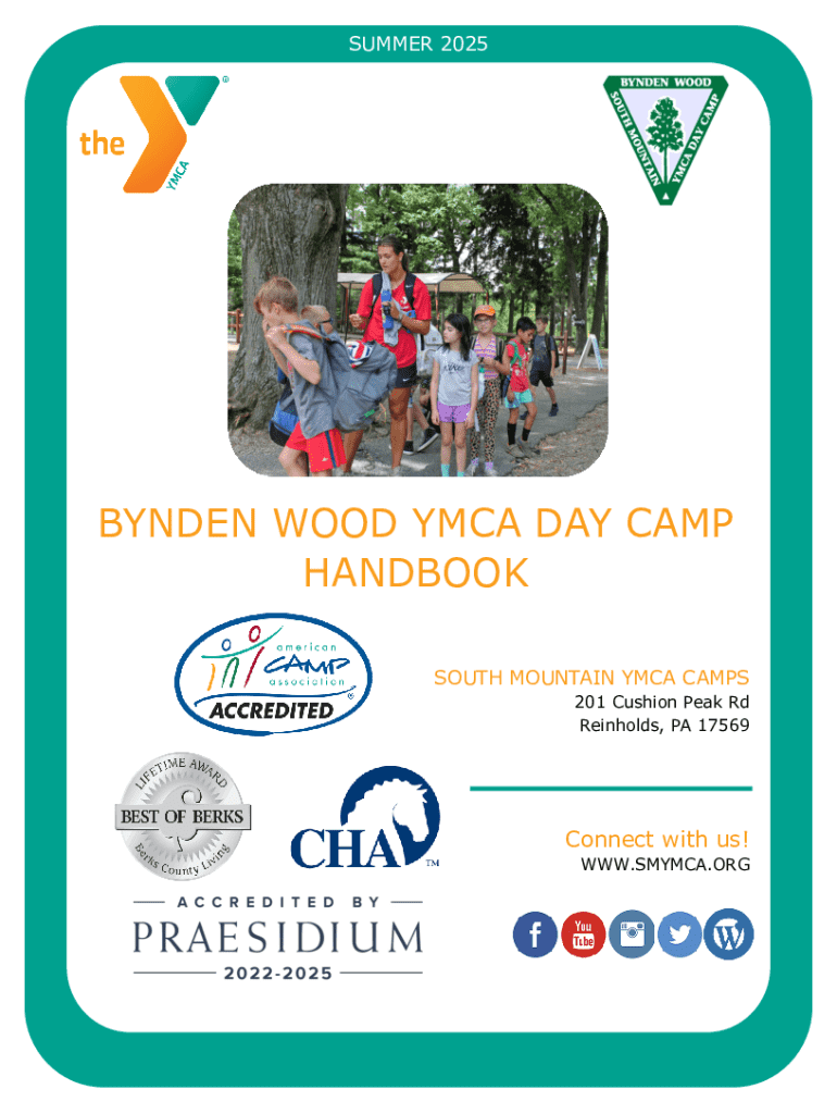 This handbook provides essential information for parents and campers regarding the Bynden Wood YMCA Day Camp, including goals of the program, registration steps, daily schedule, activities, safety