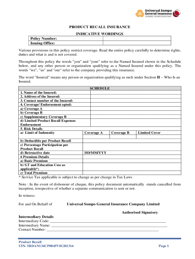 This document outlines the terms, coverage, and exclusions related to Product Recall Insurance, including coverage details, insured details, premium calculations, and procedures for claims and grievances.