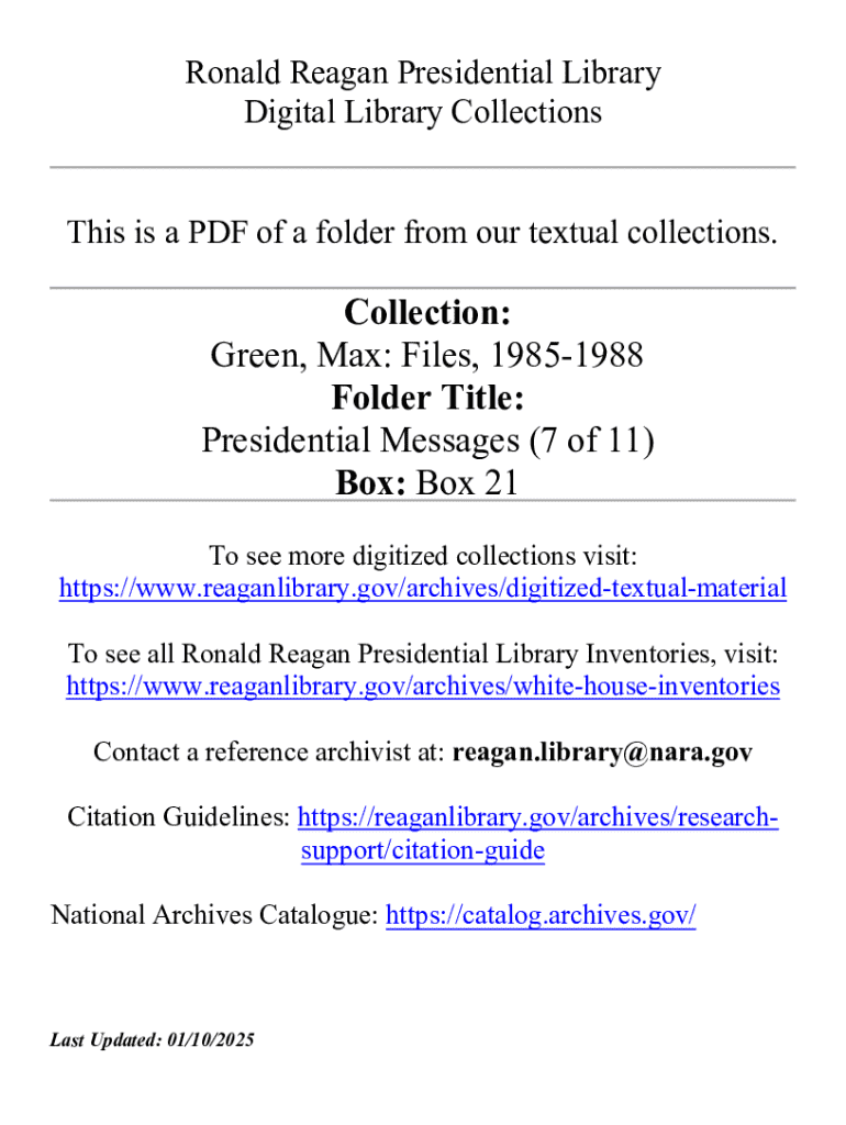 Ronald Reagan Presidential Library Digital Library Collections This is a PDF of a folder from our textual collections.Collection: Green, Max: Files, 19851988 Folder Title: Presidential Messages (7