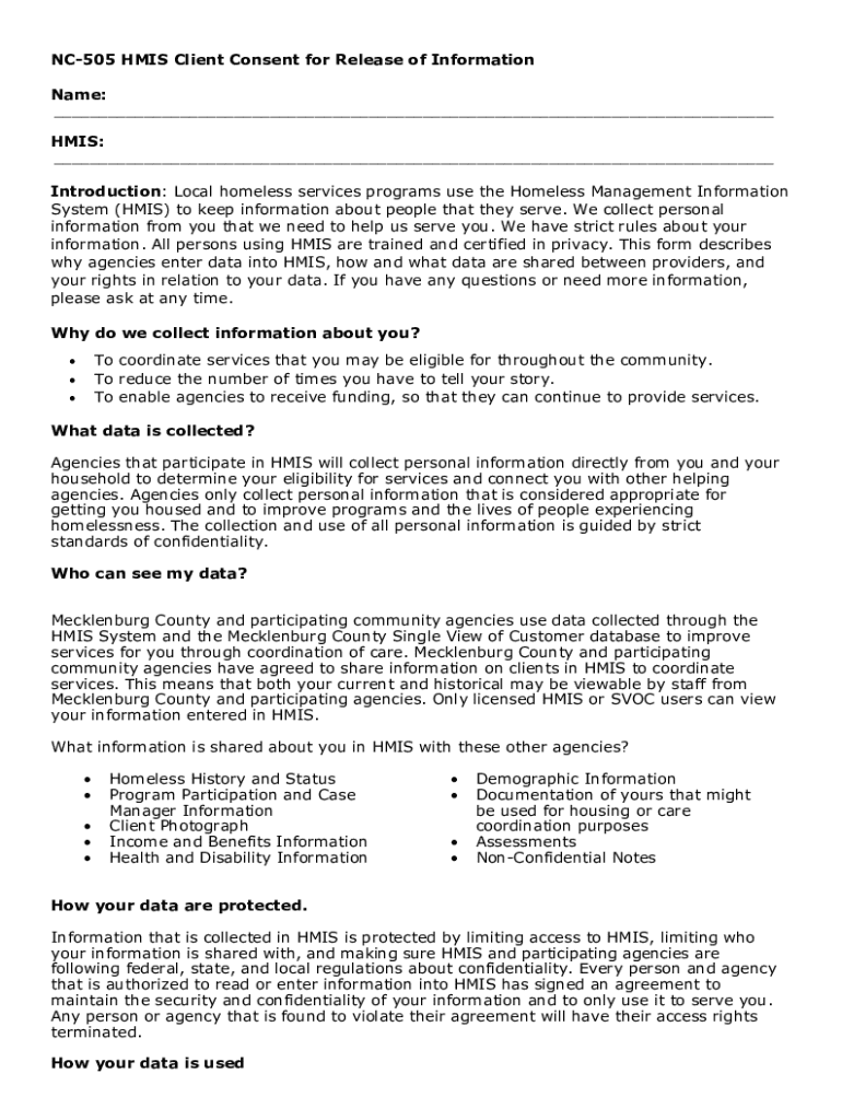 Get the free Nc-505 Hmis Client Consent for Release of Information