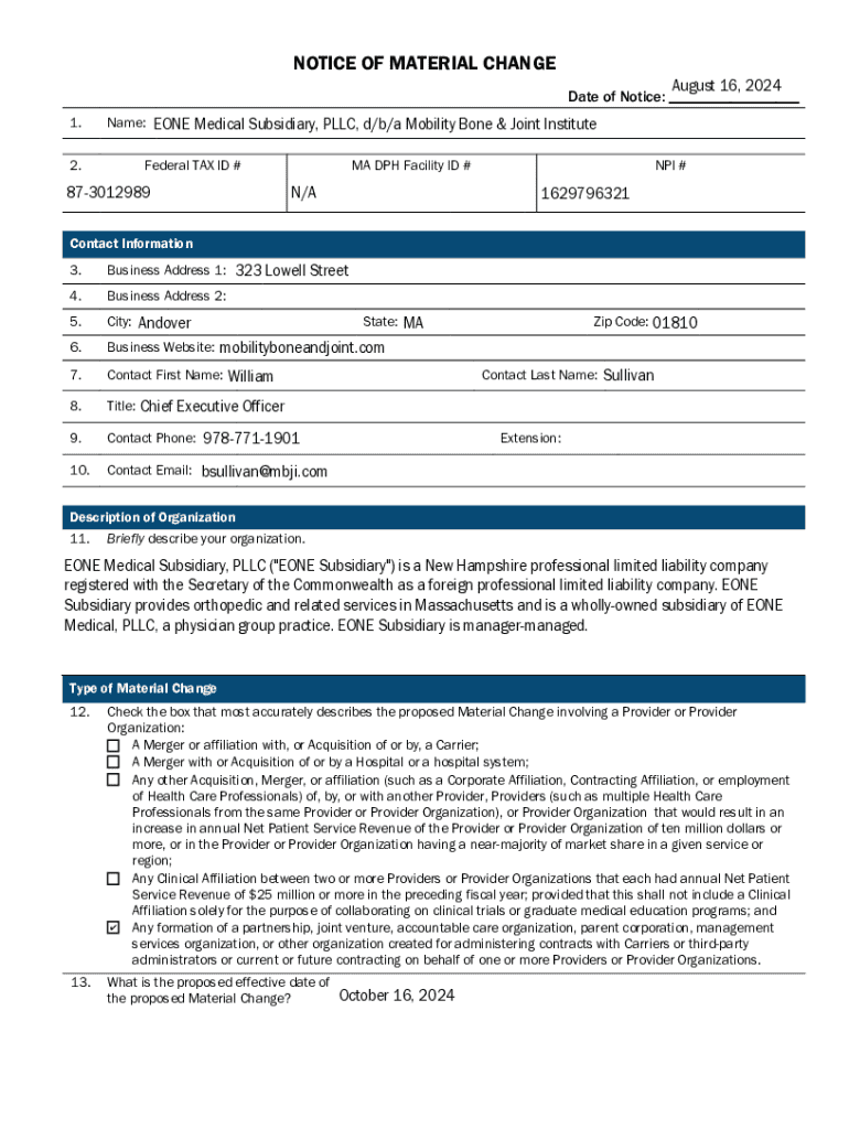 This document serves as a notice regarding material changes involving the orthopedic provider organization EONE Medical Subsidiary, PLLC and its impending merger with other practices to form the Northeast