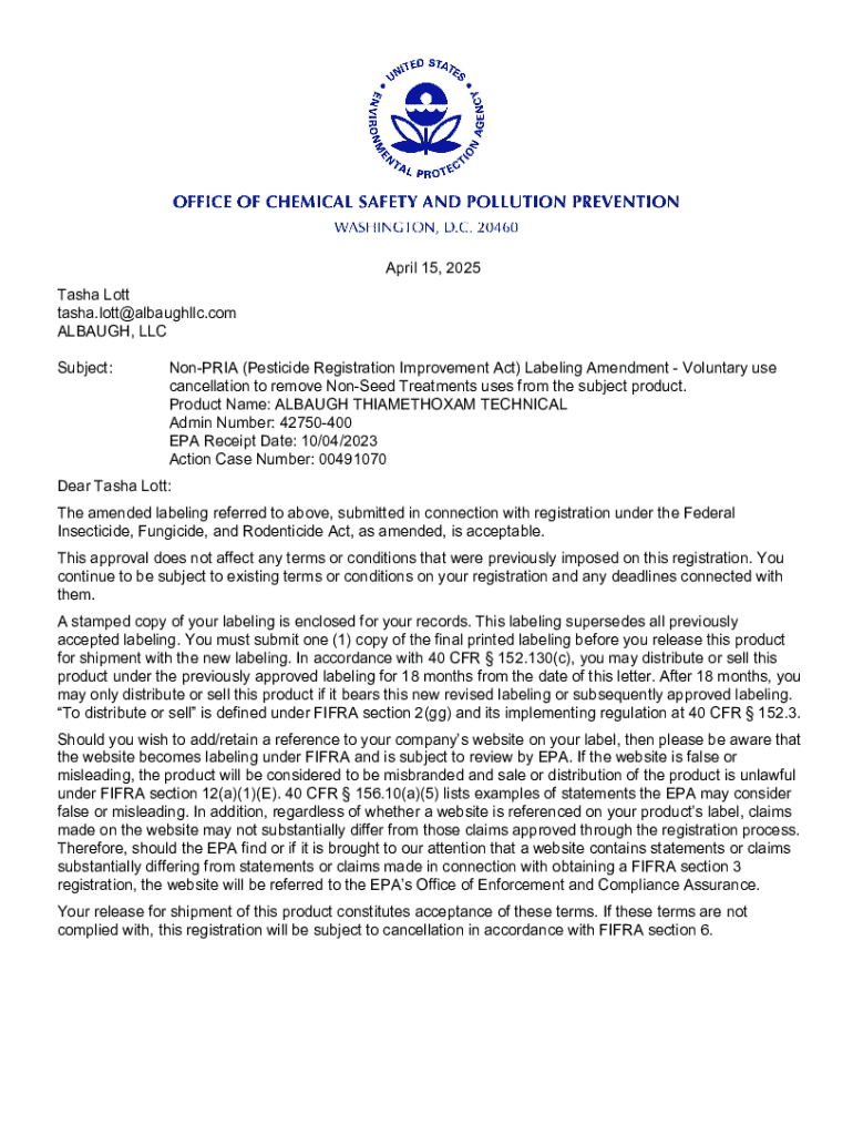 April 15, 2025 Tasha Lott tasha.lott@albaughllc.com ALBAUGH, LLC Subject:NonPRIA (Pesticide Registration Improvement Act) Labeling Amendment Voluntary use cancellation to remove NonSeed Treatments
