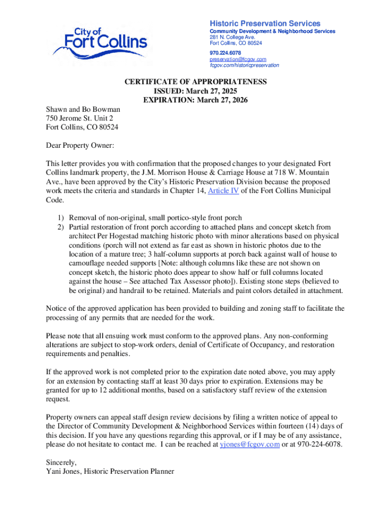 This document serves as a confirmation of approval for proposed changes to the J.M. Morrison House & Carriage House, a designated landmark property in Fort Collins, ensuring that the modifications