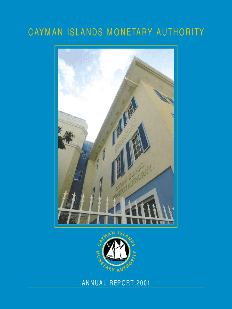 This document provides a comprehensive summary of the operations, achievements, and financial status of the Cayman Islands Monetary Authority (CIMA) for the year 2001. It includes various sections