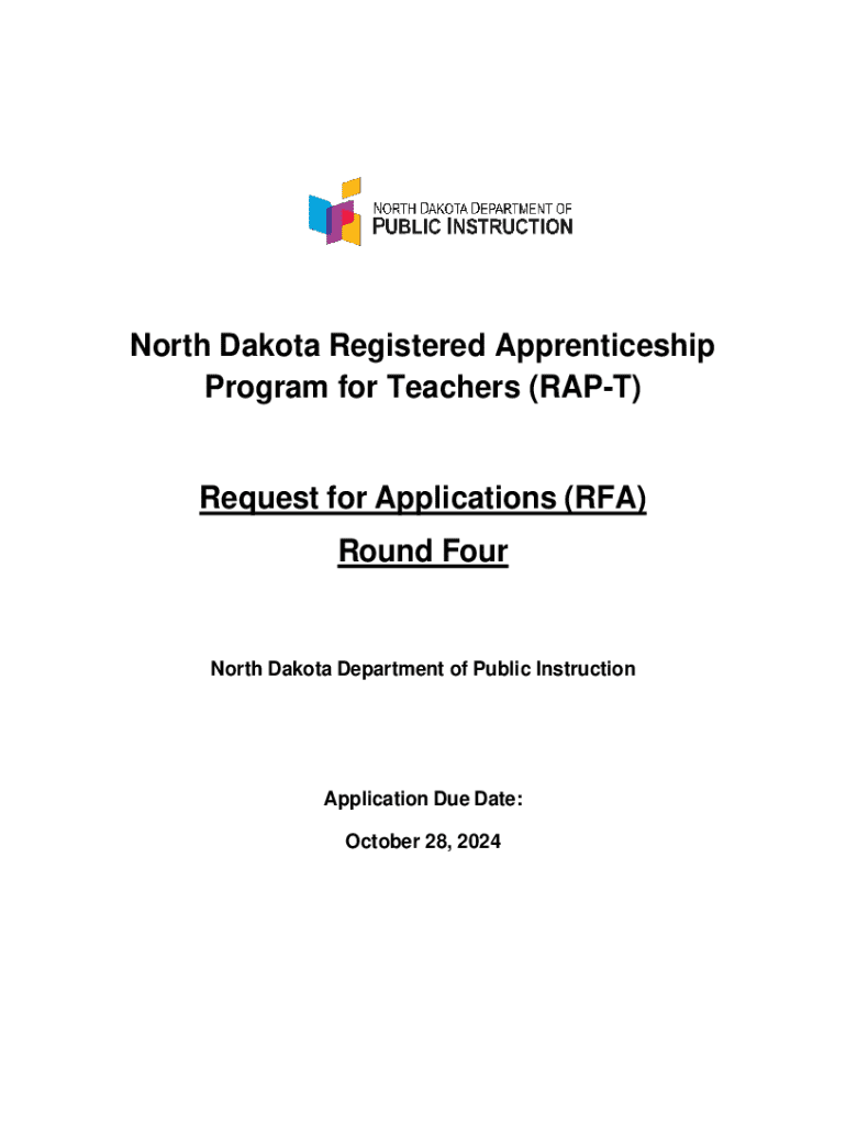 This document is a Request for Applications (RFA) from the North Dakota Department of Public Instruction for the Registered Apprenticeship Program for Teachers (RAP-T). It provides information on