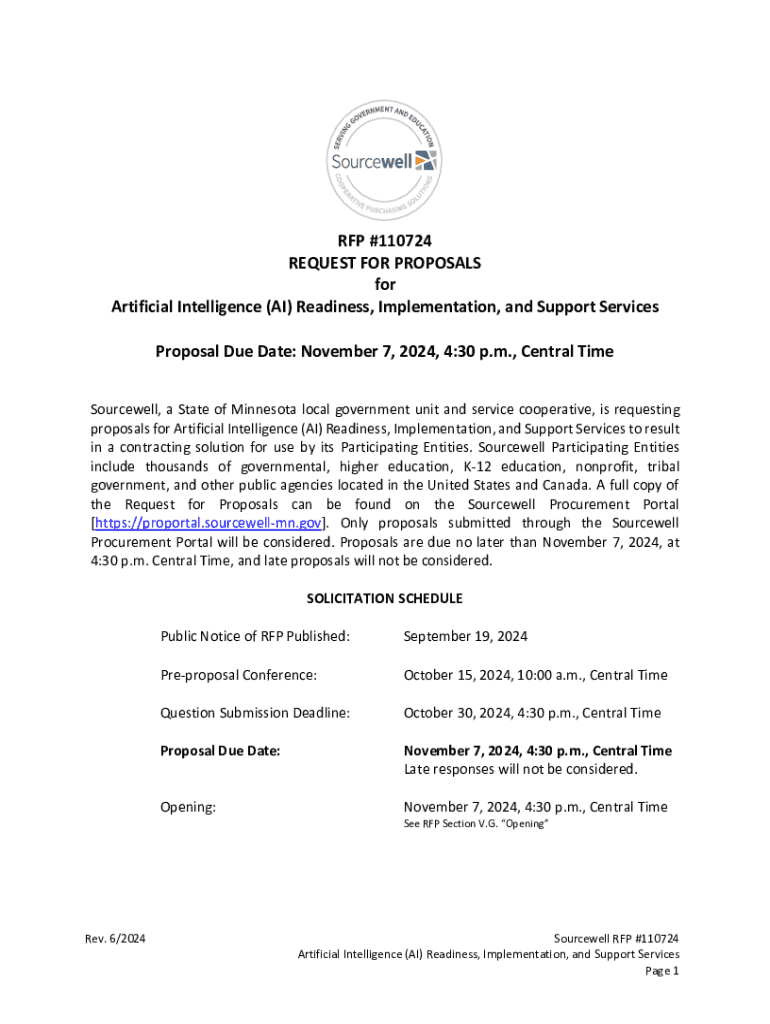 Sourcewell is requesting proposals for Artificial Intelligence (AI) Readiness, Implementation, and Support Services to provide contracting solutions for various governmental, education, and nonprofit