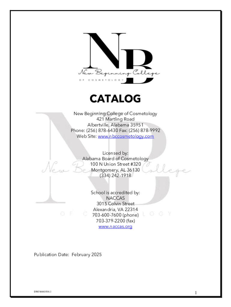 This catalog provides comprehensive information about New Beginning College of Cosmetology, including its history, mission, educational programs, admission requirements, policies, and operational