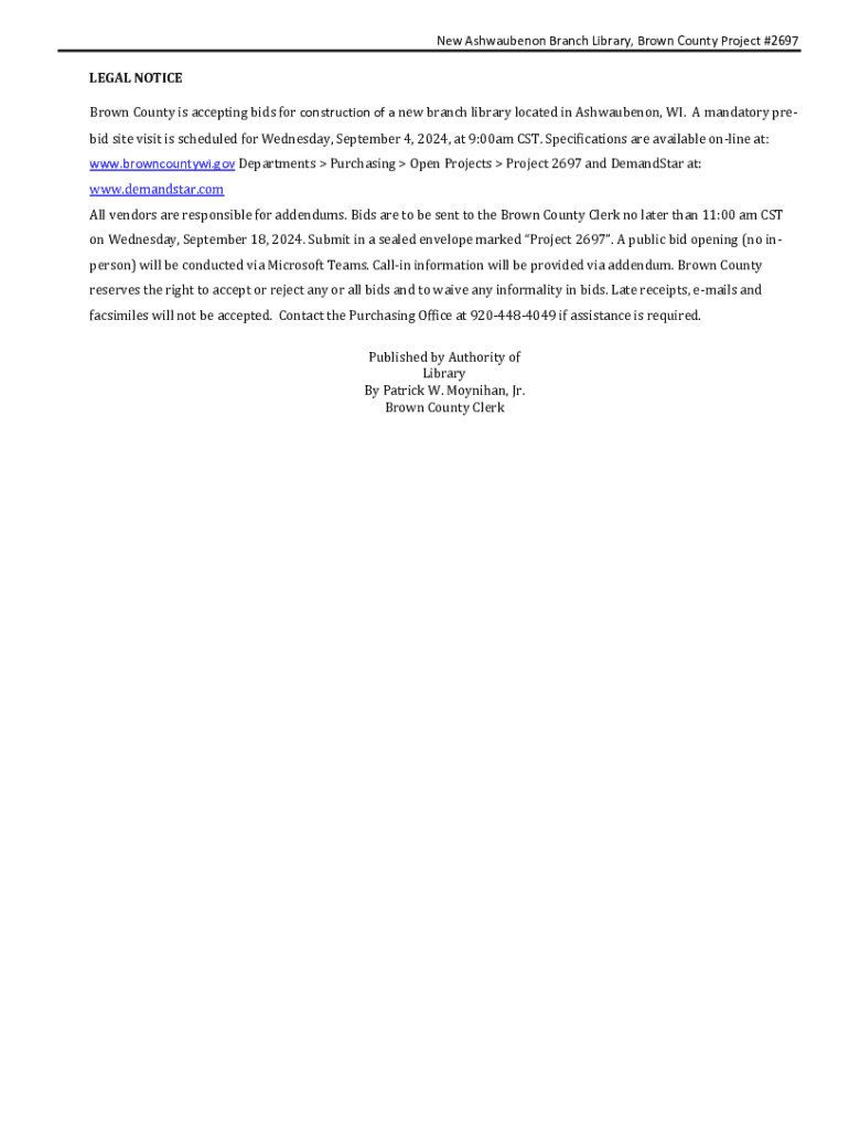 This document serves as a legal notice and request for bids for the construction of a new branch library in Ashwaubenon, WI, including specifications, timelines, and submission requirements.