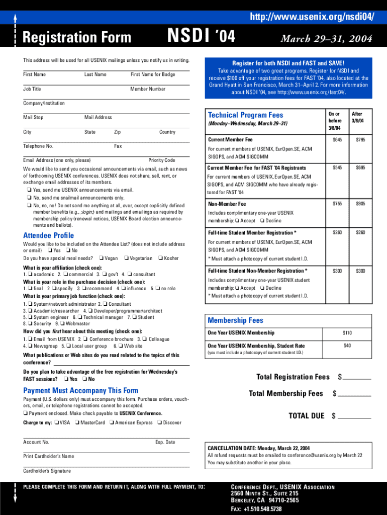 This form is used for registering for the NSDI \'04 conference, providing details such as attendee information, payment options, and meal preferences.