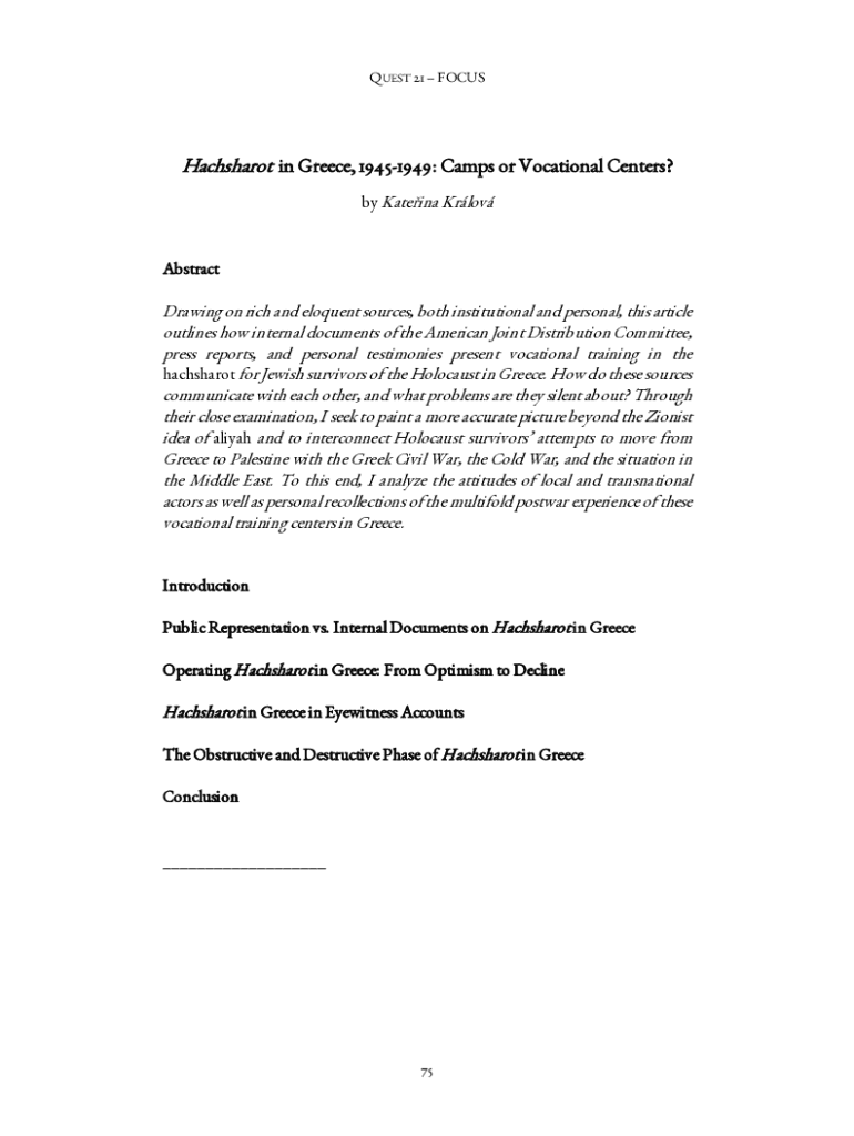 QUEST 21 FOCUSHachsharot in Greece, 19451949: Camps or Vocational Centers? by Kateina KrlovAbstractDrawing on rich and eloquent sources, both institutional and personal, this article outlines how