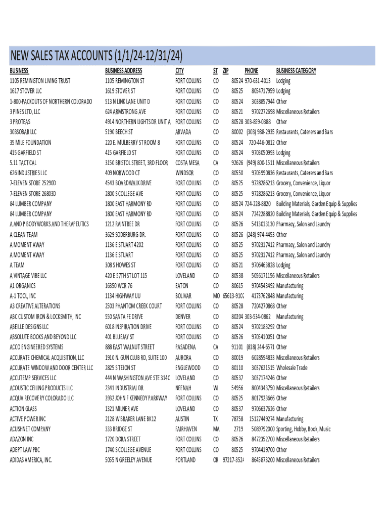 NEW SALES TAX ACCOUNTS (1/1/2412/31/24)BUSINESS 1105 REMINGTON LIVING TRUST 1617 STOVER LLC 1800PACKOUTS OF NORTHERN COLORADO 3 PINES LTD, LLC 3 PROTEAS 303SOBAR LLC 35 MILE FOUNDATION 415 GARFIELD