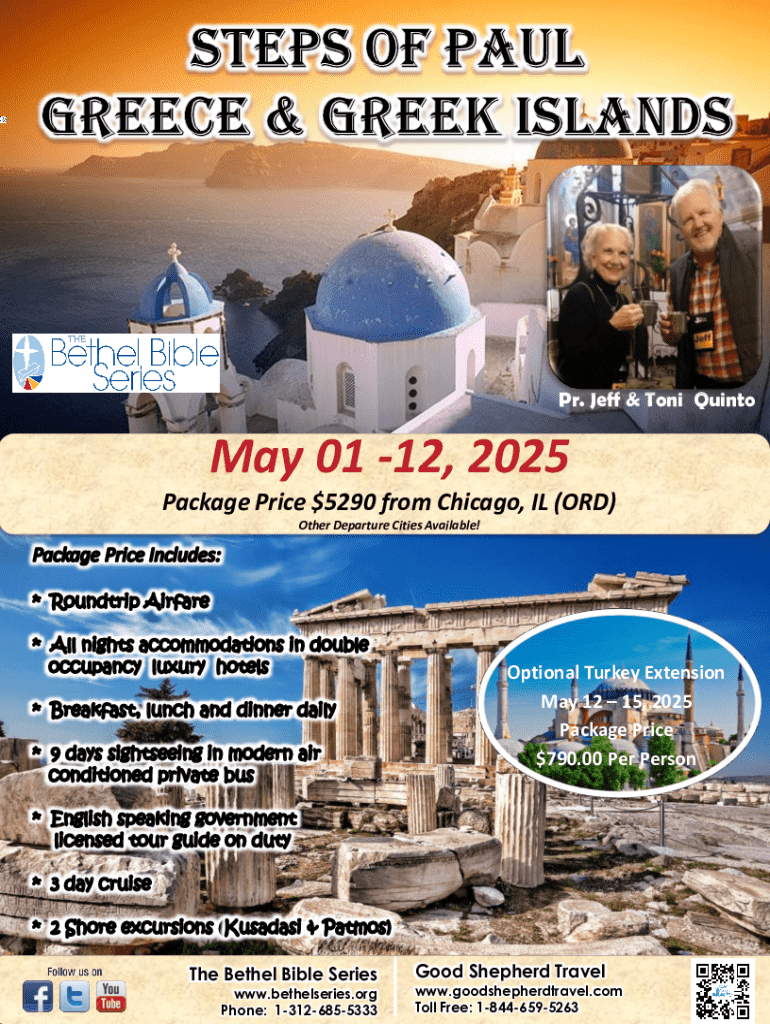 This document provides detailed information about a pilgrimage trip to Greece and the Greek islands led by Pr. Jeff & Toni Quinto, scheduled from May 01 to May 12, 2025. It includes the package price,