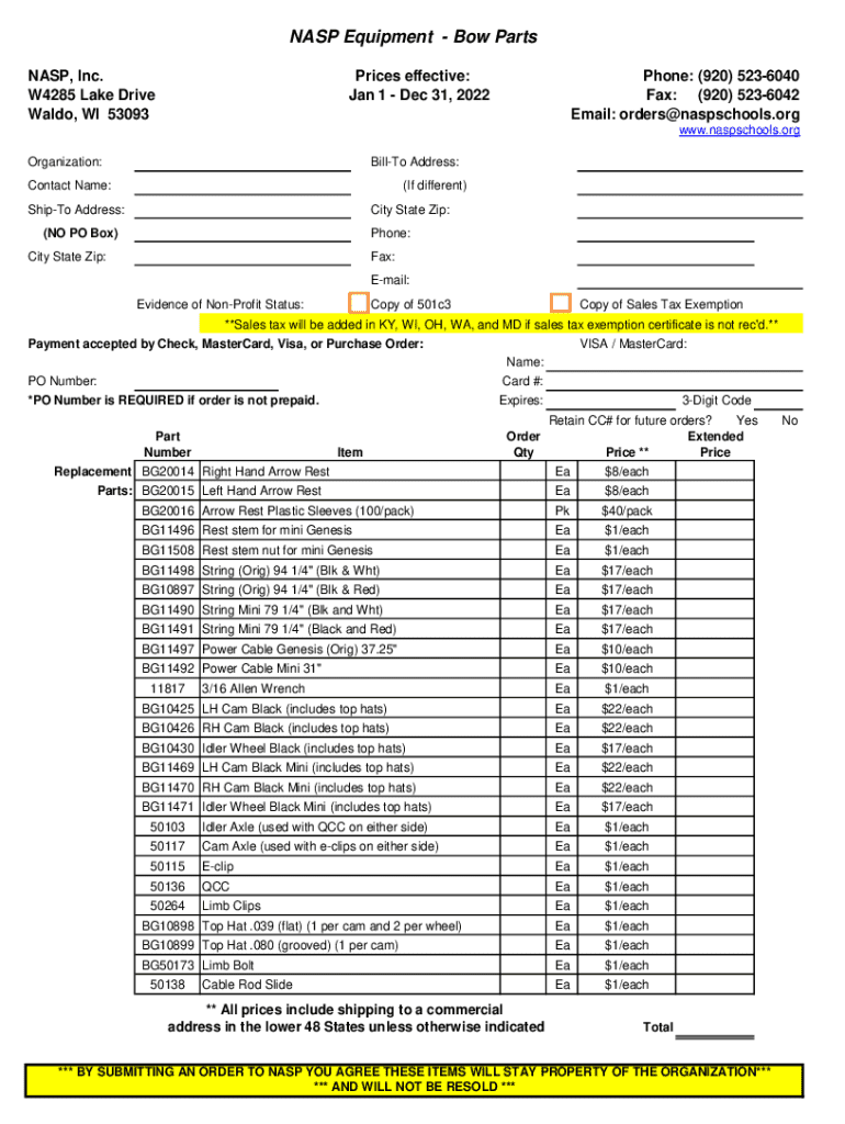 This document provides a price list for various bow parts offered by NASP, Inc., including item descriptions, part numbers, pricing, and ordering instructions for non-profit organizations.