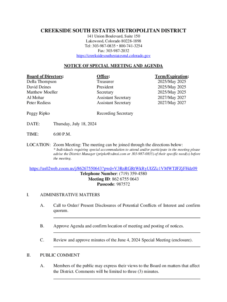 CREEKSIDE SOUTH ESTATES METROPOLITAN DISTRICT 141 Union Boulevard, Suite 150 Lakewood, Colorado 802281898 Tel: 3039870835 8007413254 Fax: 3039872032 https://creeksidesouthestatesmd.colorado.govNOTICE