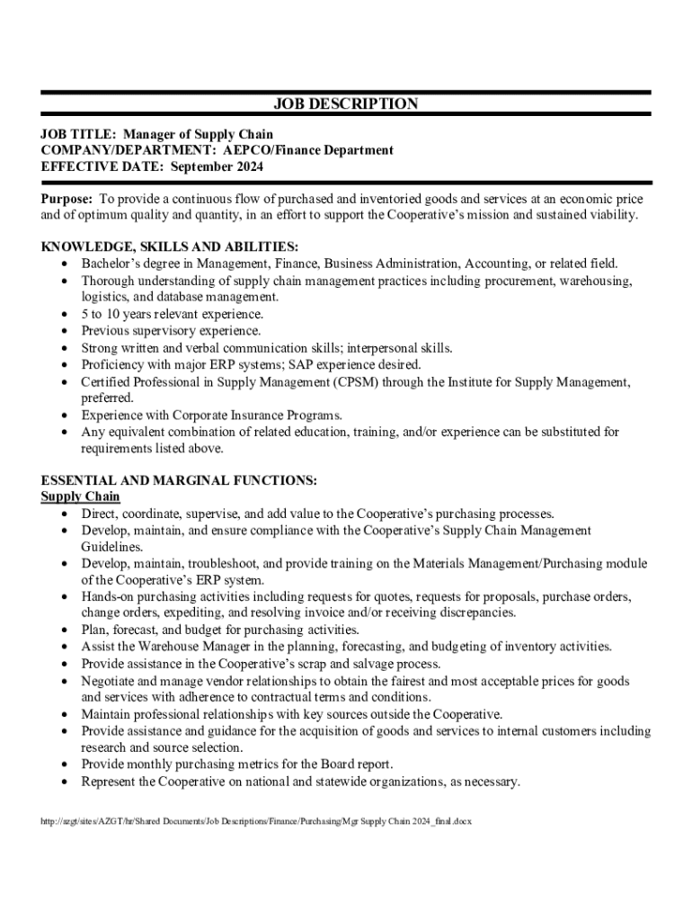 This document outlines the responsibilities, qualifications, performance measurements, and physical demands for the Manager of Supply Chain position at AEPCO, effective September 2024. It details