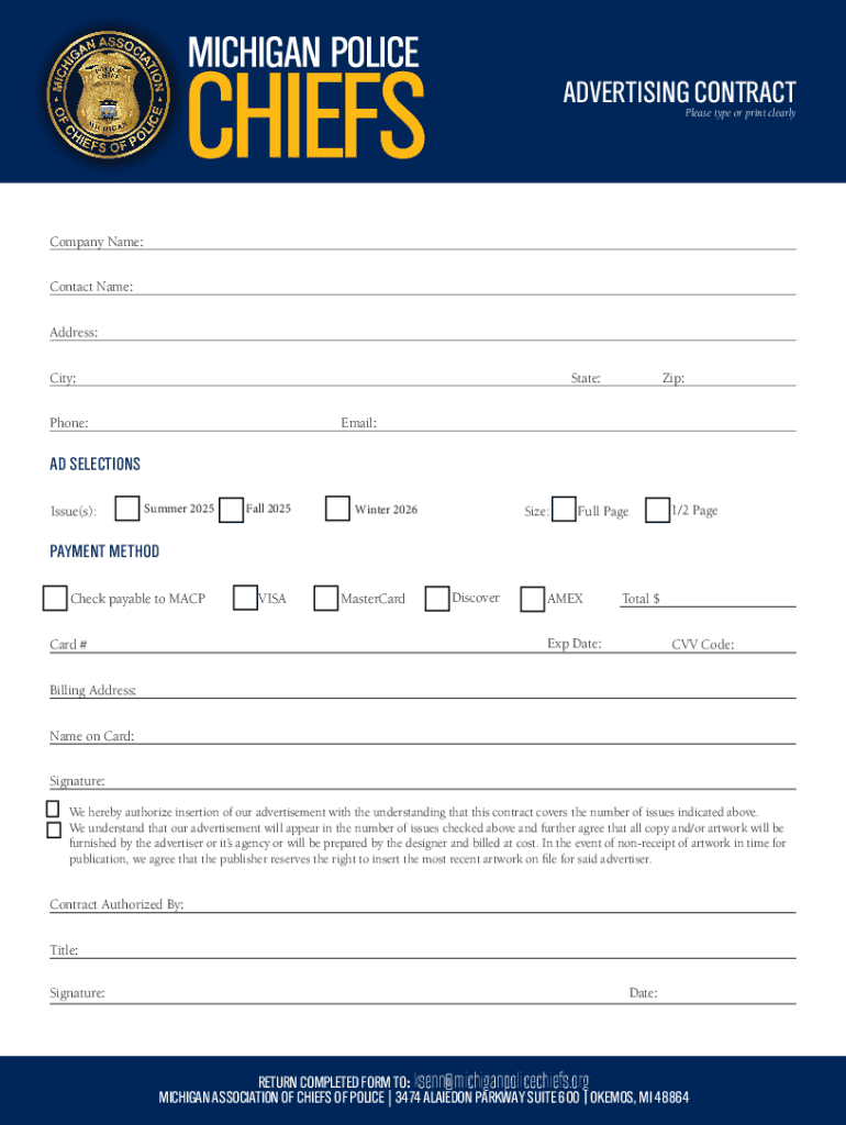This document provides production specifications and guidelines for advertising in the Michigan Police Chiefs publication, including submission details, design services, payment methods, ad rates,