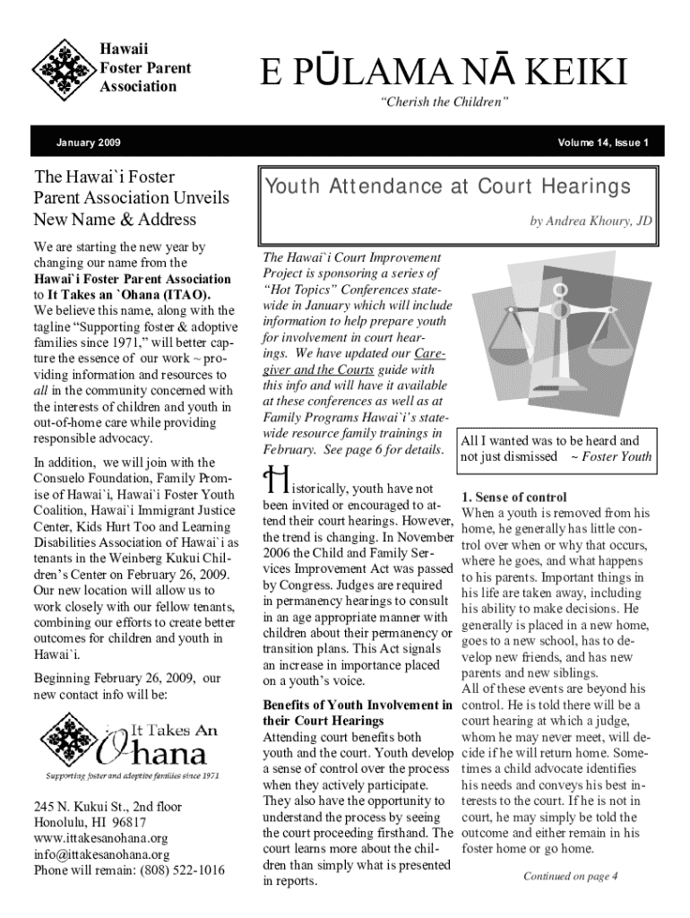 The January 2009 issue of the E PŪLAMA NĀ KEIKI newsletter discusses the new name of the Hawaii Foster Parent Association, now known as It Takes an \'Ohana. It highlights the importance of youth