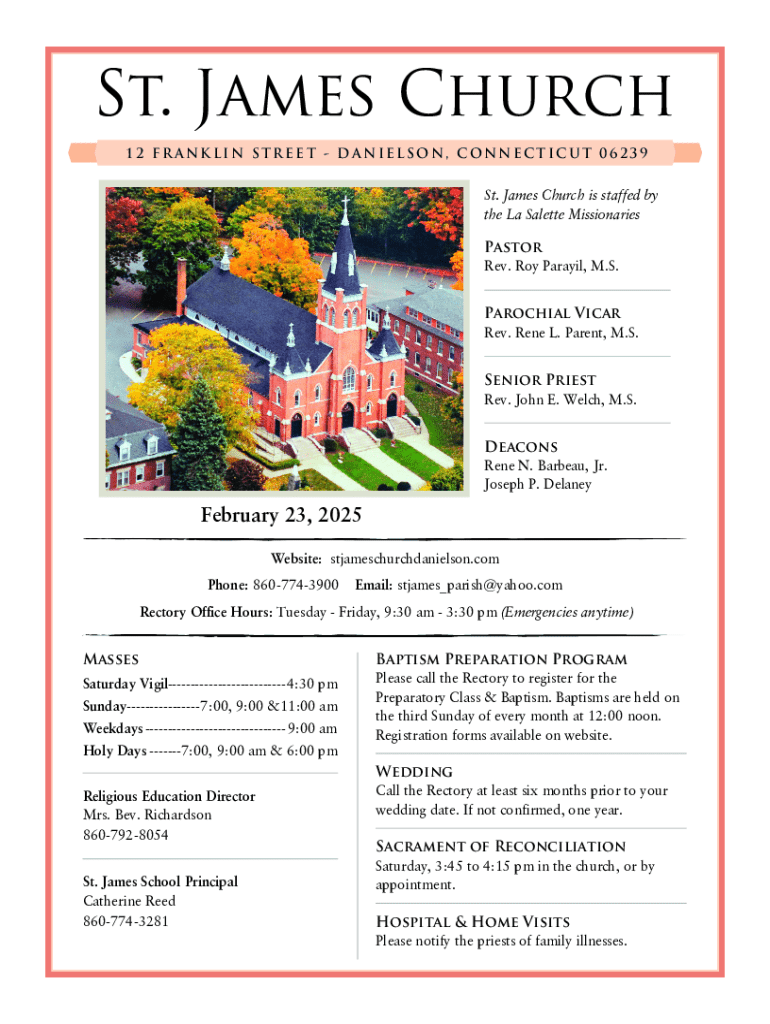 St. James Church 12 FRANKLIN STREET DANIELSON, CONNECTICUT 06239St. James Church is staffed by the La Salette MissionariesPastor Rev. Roy Parayil, M.S. Parochial Vicar Rev. Rene L. Parent, M.S. Senior