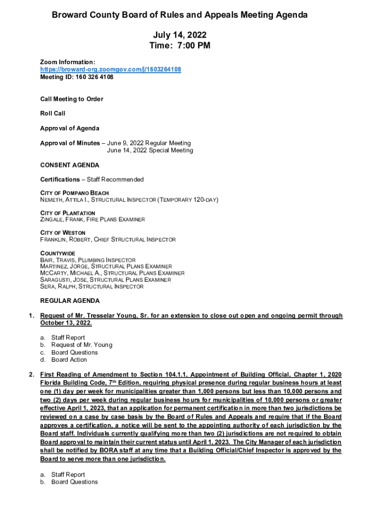 This document outlines the agenda for the Broward County Board of Rules and Appeals meeting held on July 14, 2022, including details about the meeting\'s order, consent and regular agenda items, approvals