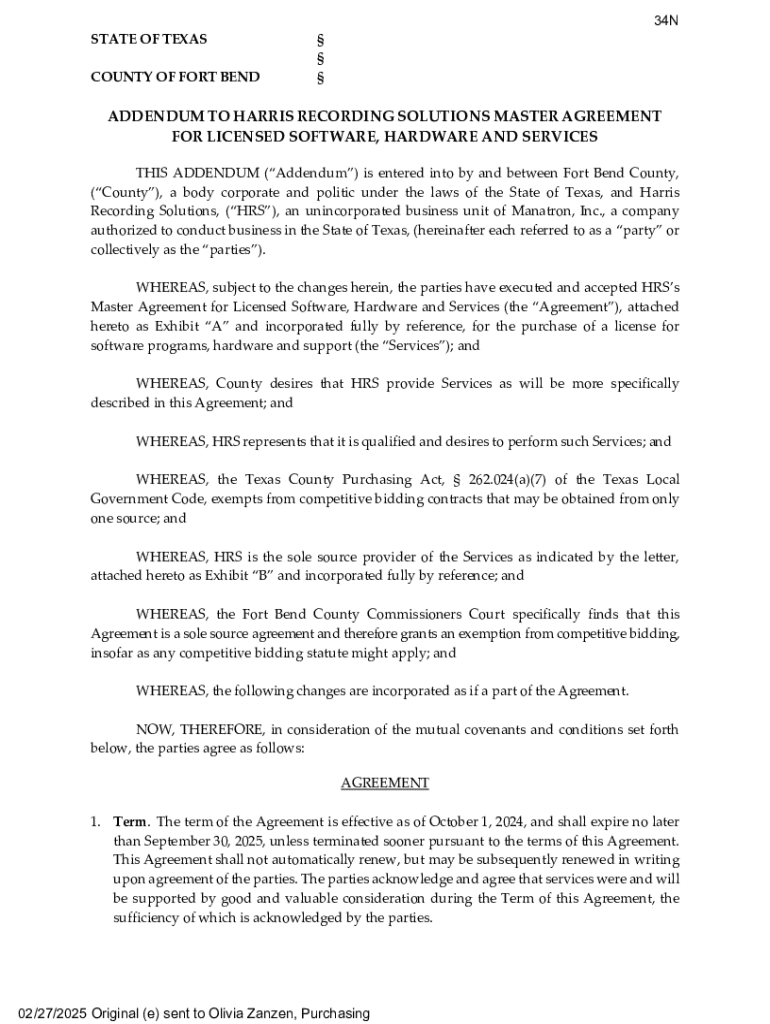 Este Addendum es un acuerdo entre el Condado de Fort Bend y Harris Recording Solutions, detallando el suministro de software, hardware y servicios. Establece los términos del contrato, incluyendo