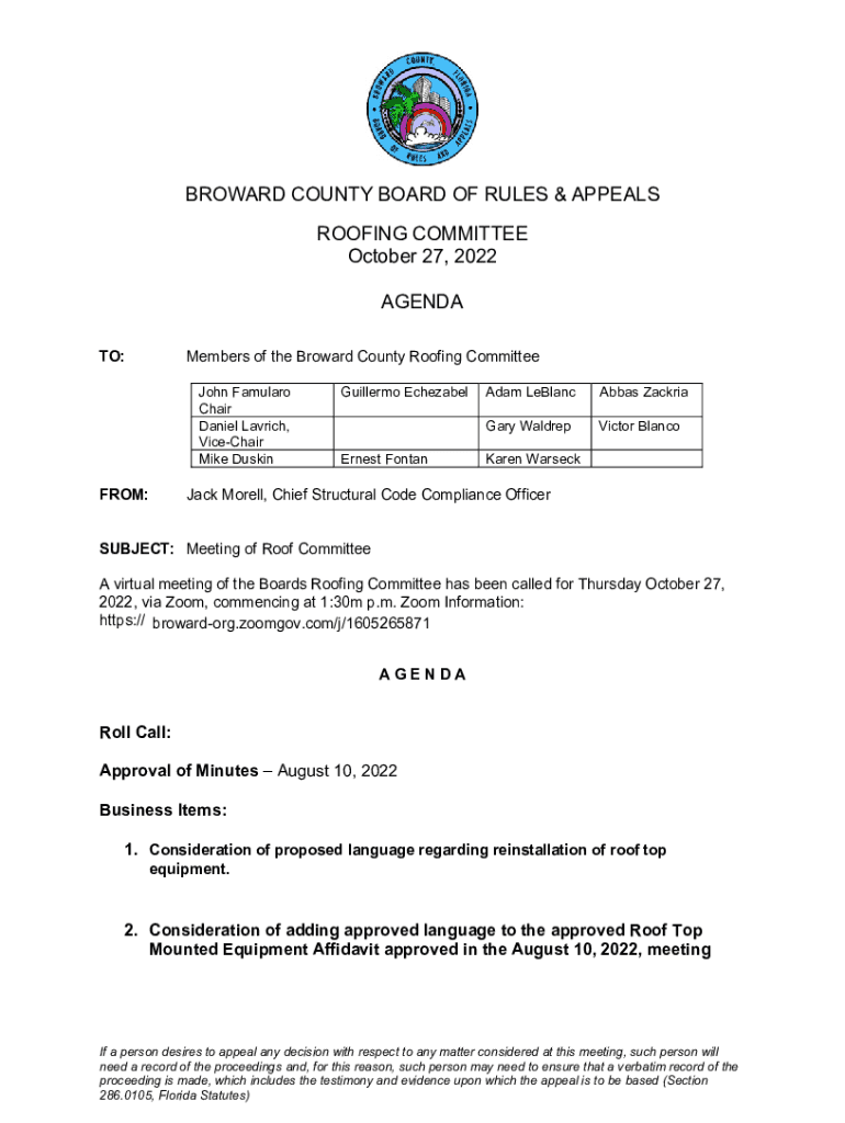 Get the free Broward County Roofing Committee Agenda and Minutes