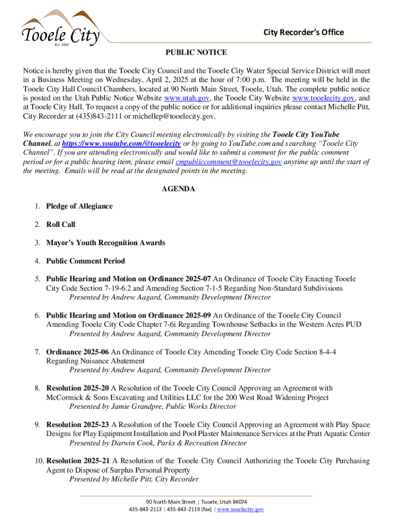%2Jefe Est . 1853Office CityRecorders Department PUBLIC NOTICENotice is hereby given that the Tooele City Council and the Tooele City Water Special Service District will meet in a Business Meeting