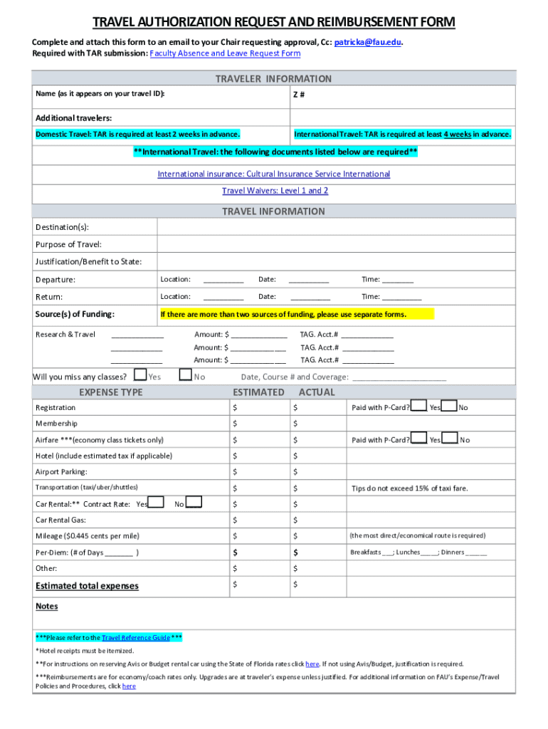 Este formulario debe completarse y adjuntarse a un correo electrónico a su presidente, solicitando aprobación. Se requiere TAR para viajes nacionales al menos 2 semanas antes y para viajes internacionales