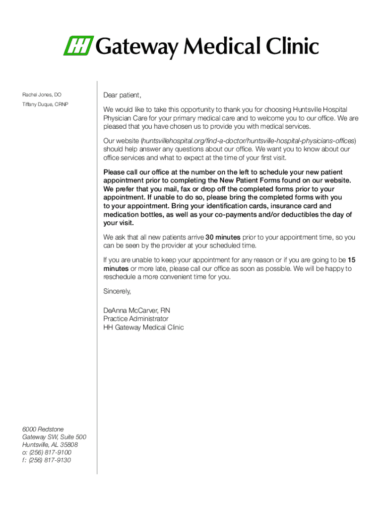 This document serves as a guide for new patients at Huntsville Hospital Physician Care, outlining the necessary steps and information required prior to their first appointment, including scheduling,