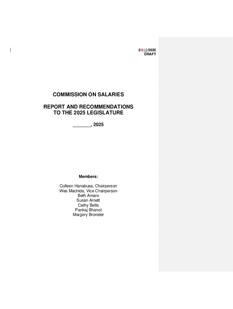 2/510/2025 DRAFTCOMMISSION ON SALARIES REPORT AND RECOMMENDATIONS TO THE 2025 LEGISLATURE ___, 2025Members: Colleen Hanabusa, Chairperson Wes Machida, Vice Chairperson Beth Amaro Susan Arnett Cathy