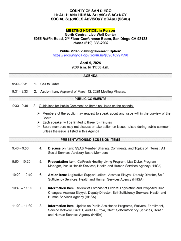 COUNTY OF SAN DIEGO HEALTH AND HUMAN SERVICES AGENCY SOCIAL SERVICES ADVISORY BOARD (SSAB) MEETING NOTICE: In Person North Central Live Well Center 5055 Ruffin Road, 2nd Floor Conference Room, San