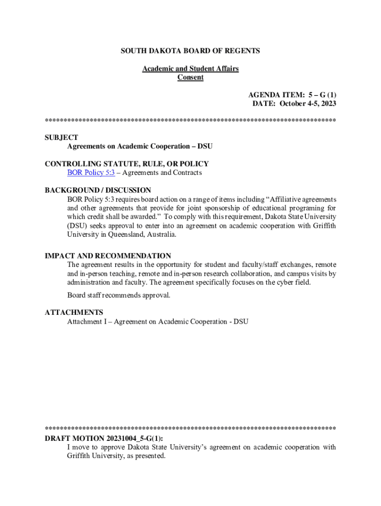SOUTH DAKOTA BOARD OF REGENTS Academic and Student Affairs Consent AGENDA ITEM: 5 G (1) DATE: October 45, 2023 ****************************************************************************** SUBJECT