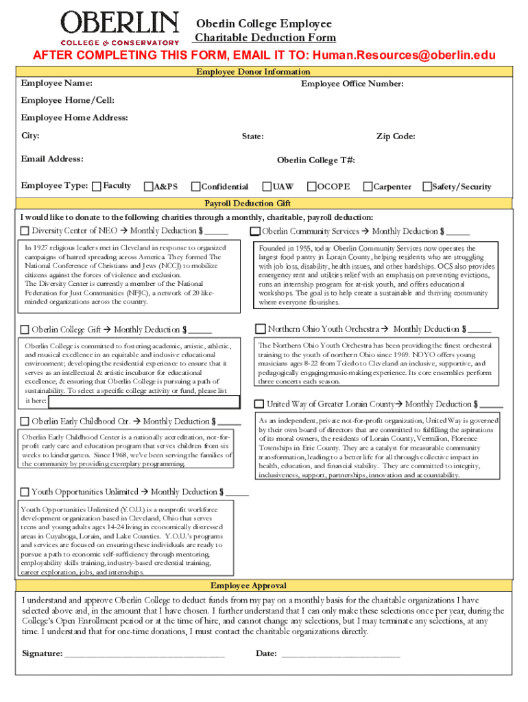 Obtain the Oberlin College employee charitable contribution form from the HR department or the college's website.