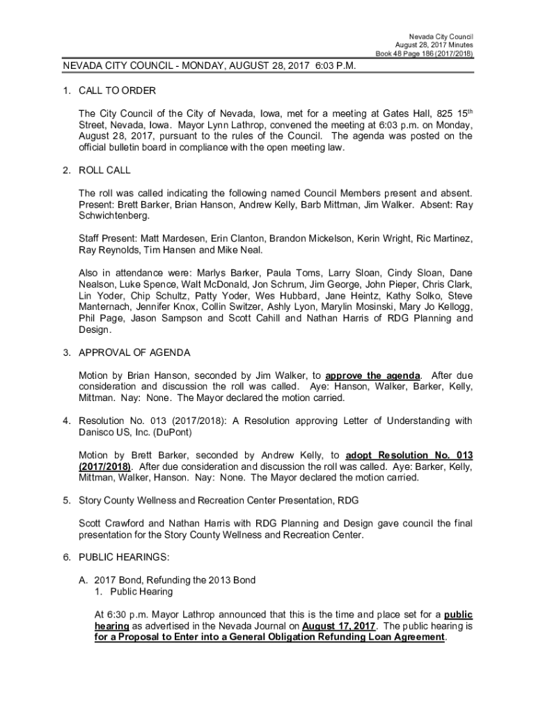 Minutes from the Nevada City Council meeting held on August 28, 2017, detailing the discussions, motions, and resolutions passed during the meeting.