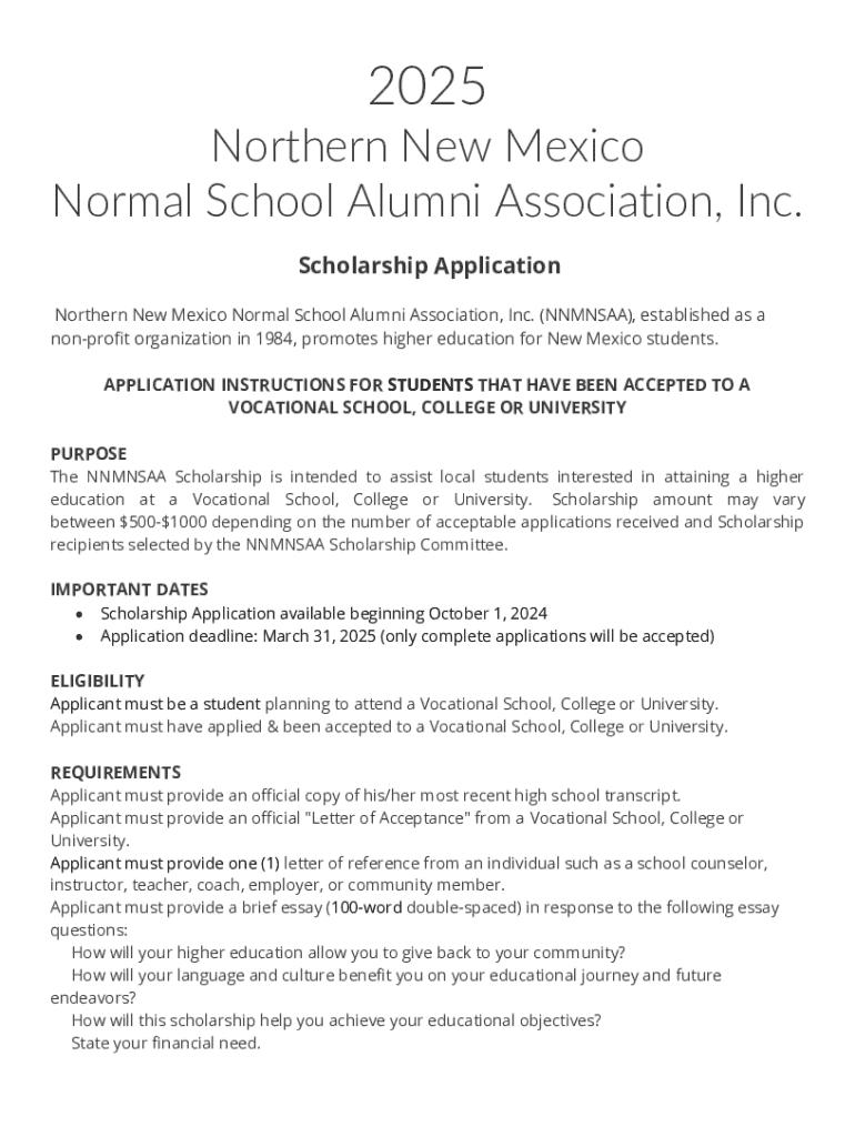 This scholarship application is for students who have been accepted to a vocational school, college, or university and are seeking financial assistance from the Northern New Mexico Normal School Alumni