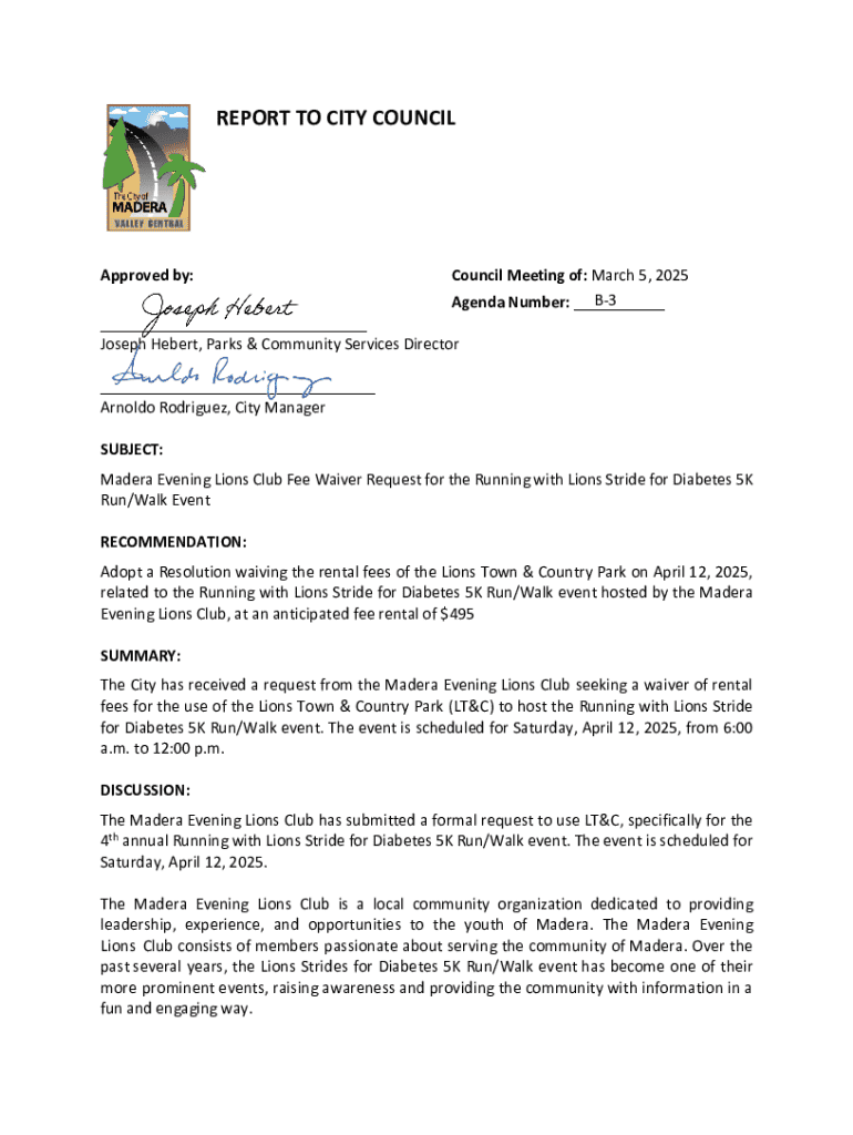 This document is a report to the City Council recommending the waiver of rental fees for the Lions Town & Country Park for the Madera Evening Lions Club\'s Running with Lions Stride for Diabetes 5K