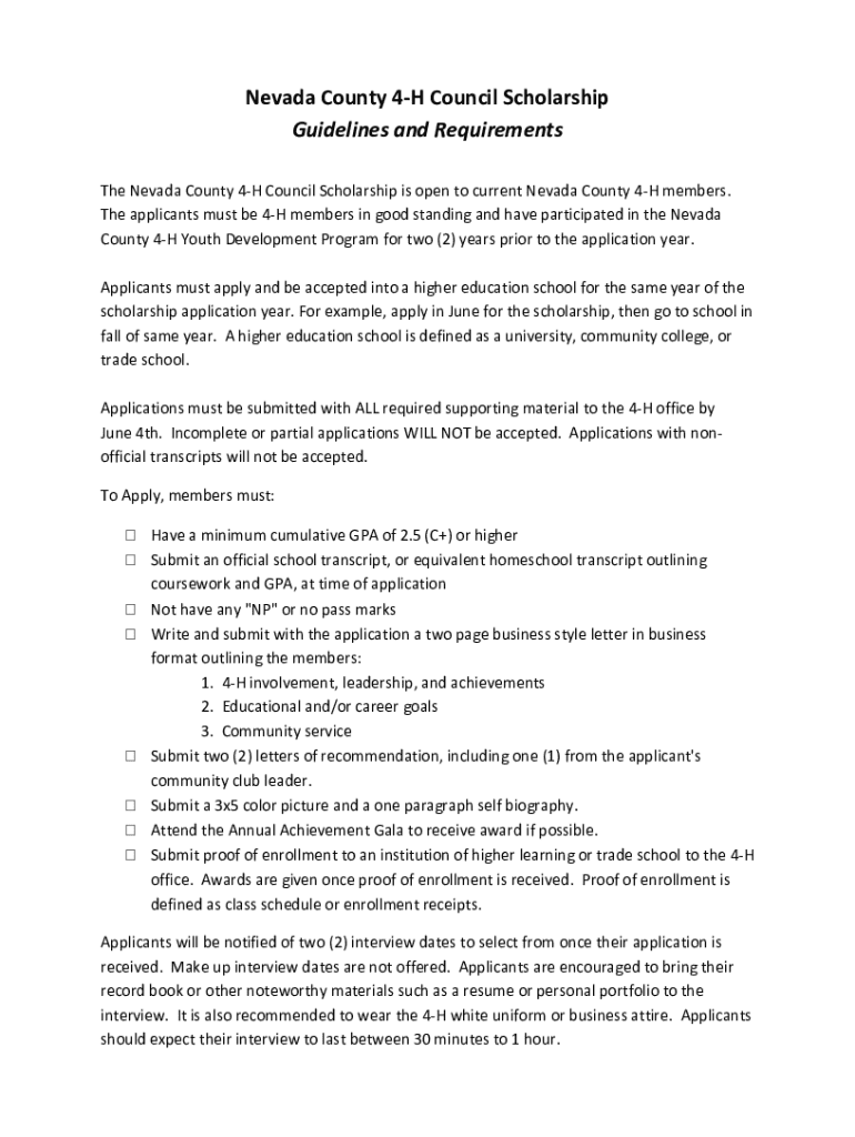 Este documento describe las pautas y requisitos para solicitar la Beca del Consejo 4-H del Condado de Nevada, incluyendo la elegibilidad, requisitos de aplicación y el proceso de selección.