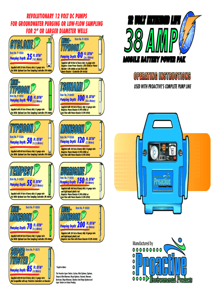 REVOLUTIONARY 12 VOLT DC PUMPS FOR GROUNDWATER PURGING OR LOWFLOW SAMPLING FOR 2 OR LARGER DIAMETER WELLS Item No. P10350Item No. P10100Pumping Depth:25 Ft. DTW*(7.62 Meters)Supplied with 35 feet