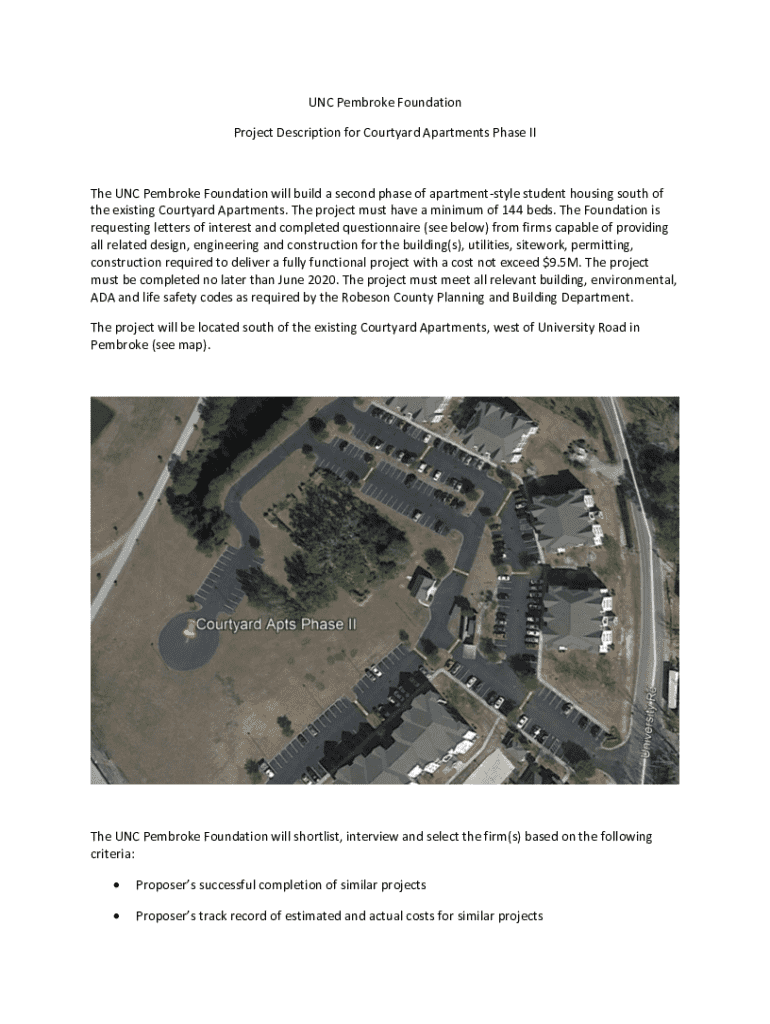 This document solicits qualified firms to submit their interest and capabilities for the design, engineering, and construction of the Courtyard Apartments Phase II at UNC Pembroke. The project requires
