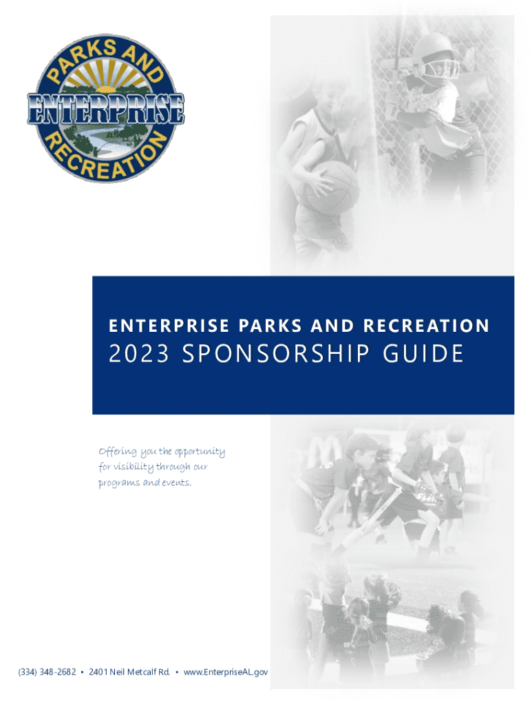 This document provides information about sponsorship opportunities available through the Enterprise Parks and Recreation Department, including various sponsorship levels and their associated benefits.
