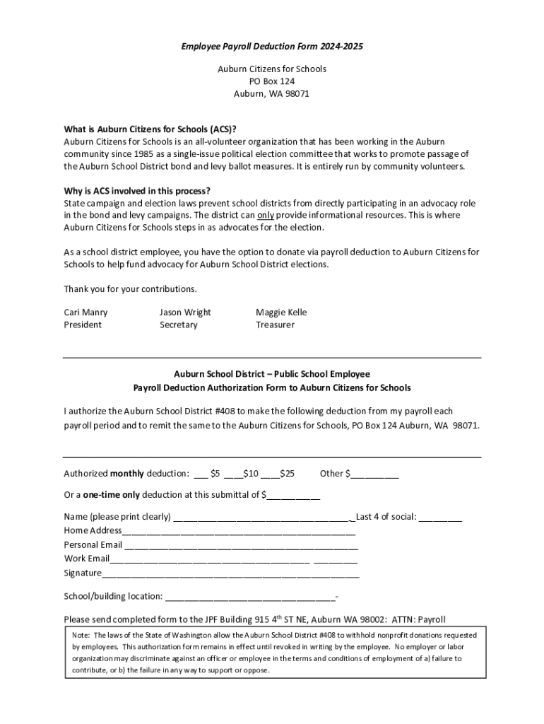 This form is for Auburn School District employees to authorize payroll deductions for contributions to Auburn Citizens for Schools, which advocates for school district bond and levy measures.