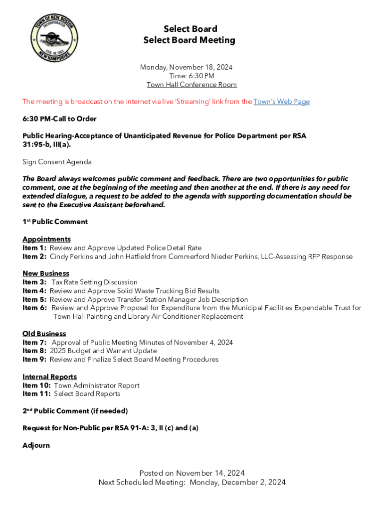 This document contains the agenda for the New Boston Select Board meeting scheduled on November 18, 2024. It includes the call to order, a public hearing on the acceptance of unanticipated revenue