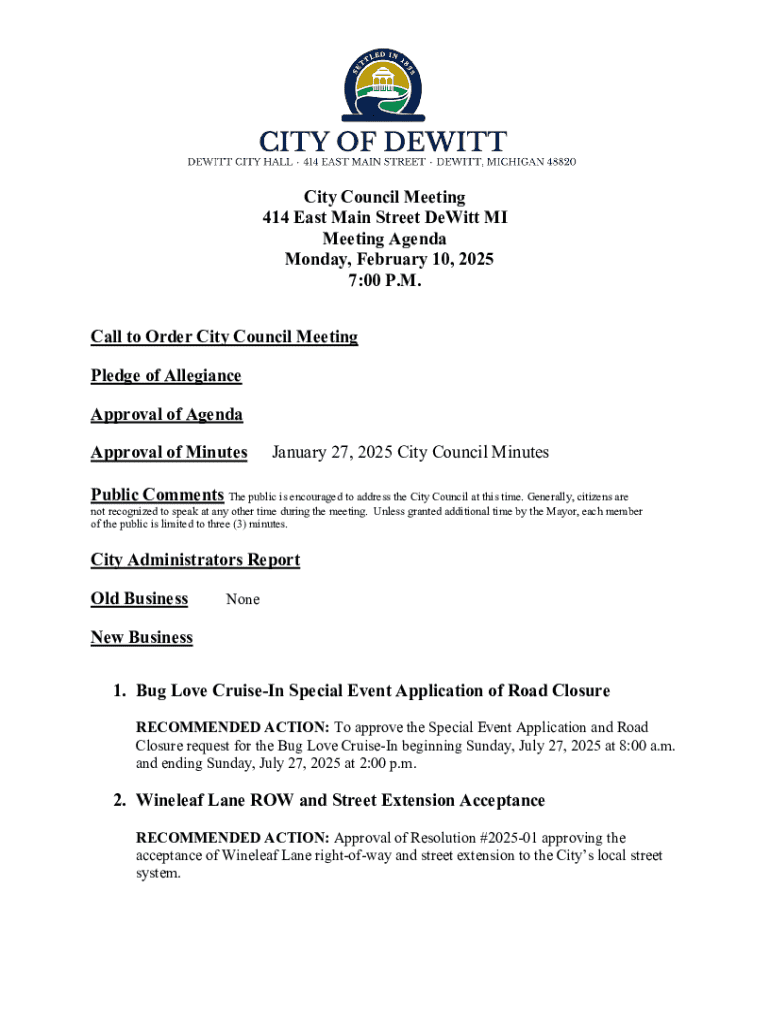 City Council Meeting 414 East Main Street DeWitt MI Meeting Agenda Monday, February 10, 2025 7:00 P.M. Call to Order City Council Meeting Pledge of Allegiance Approval of Agenda Approval of MinutesJanuary