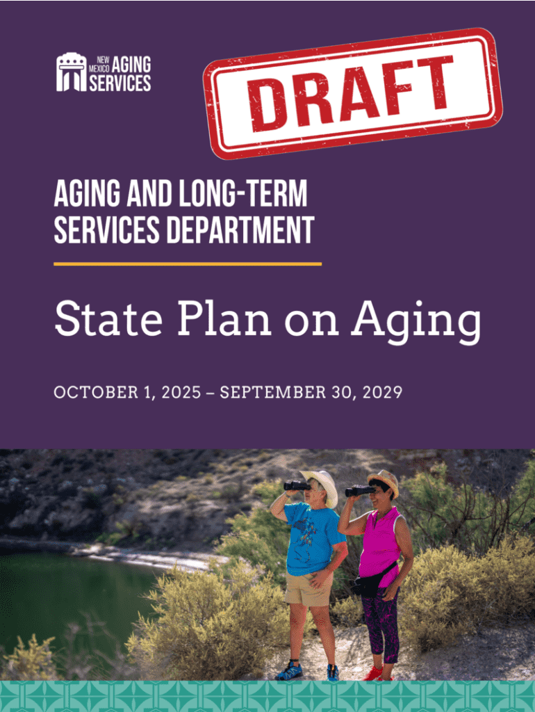 This document is a draft version of the New Mexico State Plan on Aging prepared by the New Mexico Aging and Long-Term Services Department. It aims to enhance transparency and gather public input,