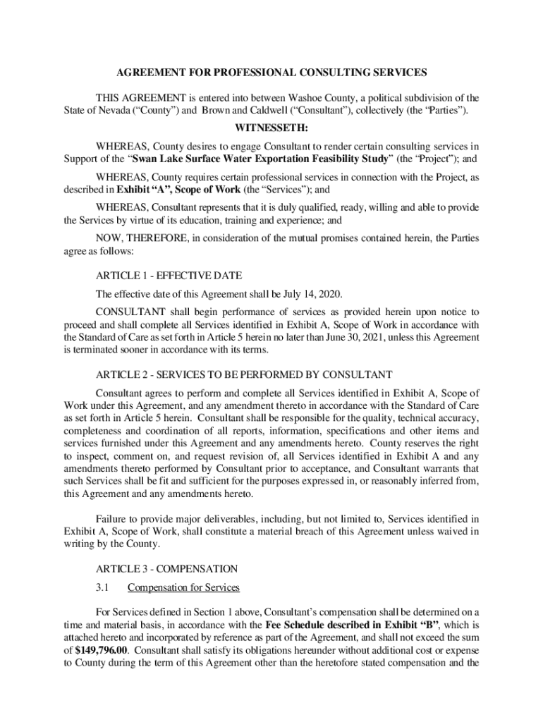 Este acuerdo se celebra entre Washoe County y Brown and Caldwell para proporcionar servicios de consultoría relacionados con el estudio de viabilidad de exportación de agua superficial del Lago